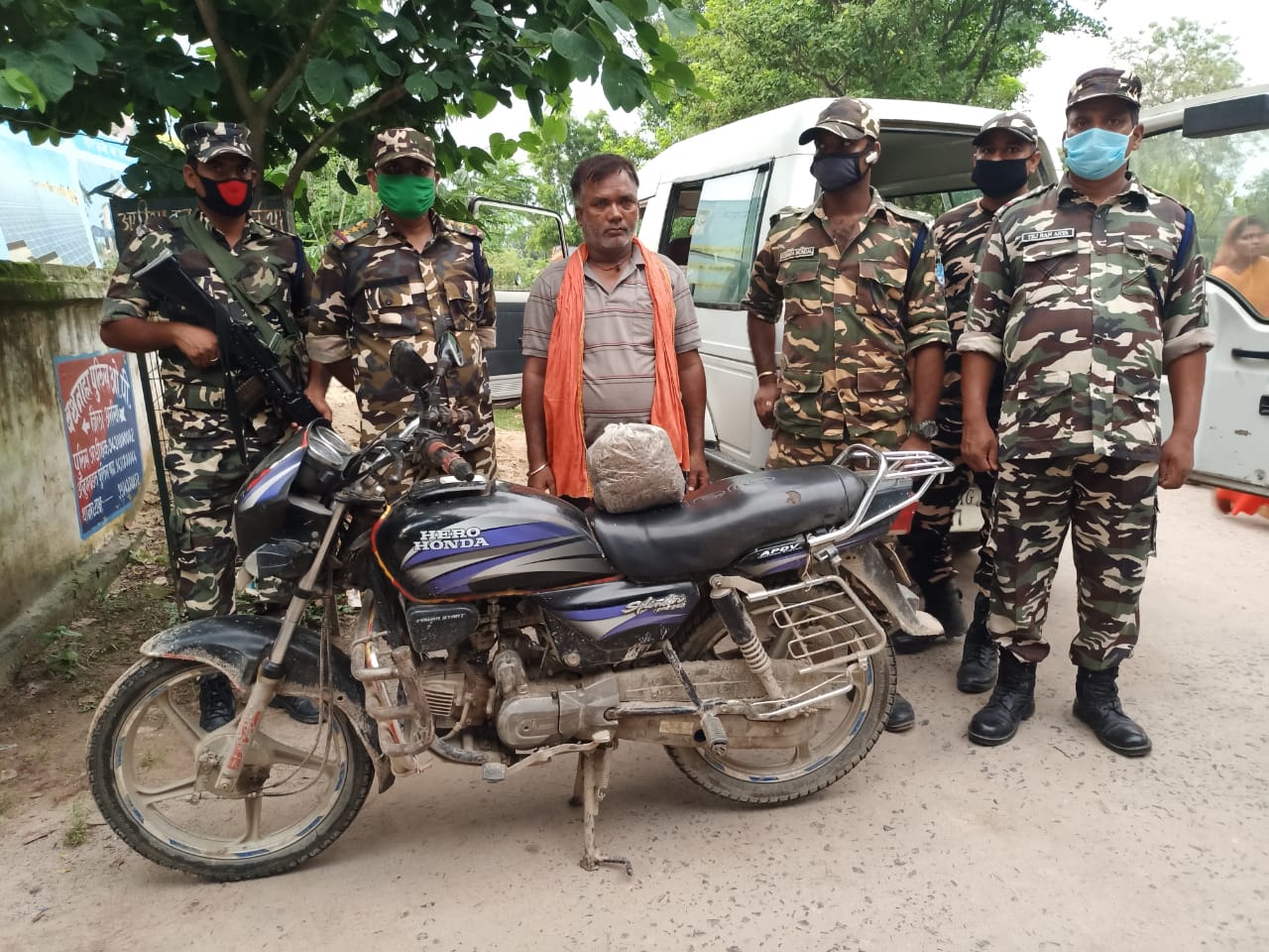 गुप्त सूचना के आधार पर SSB 56वी वाहनी बटालियन ए कंपनी कुशमाहा के द्वारा स्पेशल पेट्रोलिंग के दौरान स्पेक्टर राजकुमार के नेतृत्व में पिलर संख्या 171/165 के पास भारतीय सीमा में 6 किलोमीटर अंदर धमदाहा चौक से पश्चिम शाहबाजपुर के पास 975 ग्राम गाजा के साथ एक तस्कर को गिरफ्तार किया और एक भागने में सफल रहा।