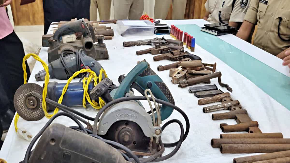 👉 6 कट्टा, 8 कारतूस, 4 अधनिर्मित बैरल, 4 ट्रिगर और कई औजार।