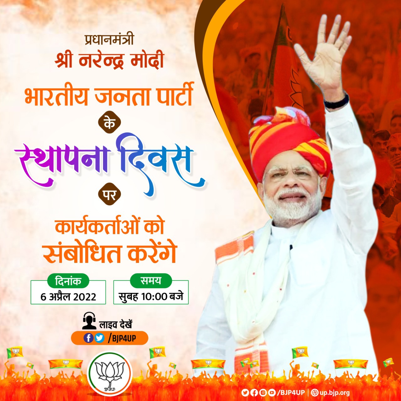 प्रधानमंत्री श्री narendramodi 6 अप्रैल, 2022 को सुबह 10 बजे भारतीय जनता पार्टी के 42वें स्थापना दिवस के अवसर पर कार्यकर्ताओं को संबोधित करेंगे।