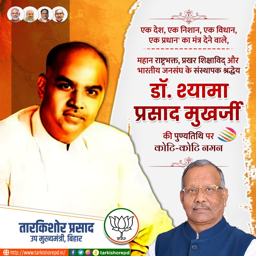 देश की एकता व अखंडता की रक्षा के लिए अपना सर्वस्व अर्पित कर देने वाले,महान राष्ट्रवादी विचारक,शिक्षाविद तथा भारतीय जनसंघ के संस्थापक श्रद्धेय डॉ श्यामा प्रसाद मुखर्जी जी के बलिदान दिवसपर विनम्र श्रद्धांजलि व कोटि कोटि नमन।