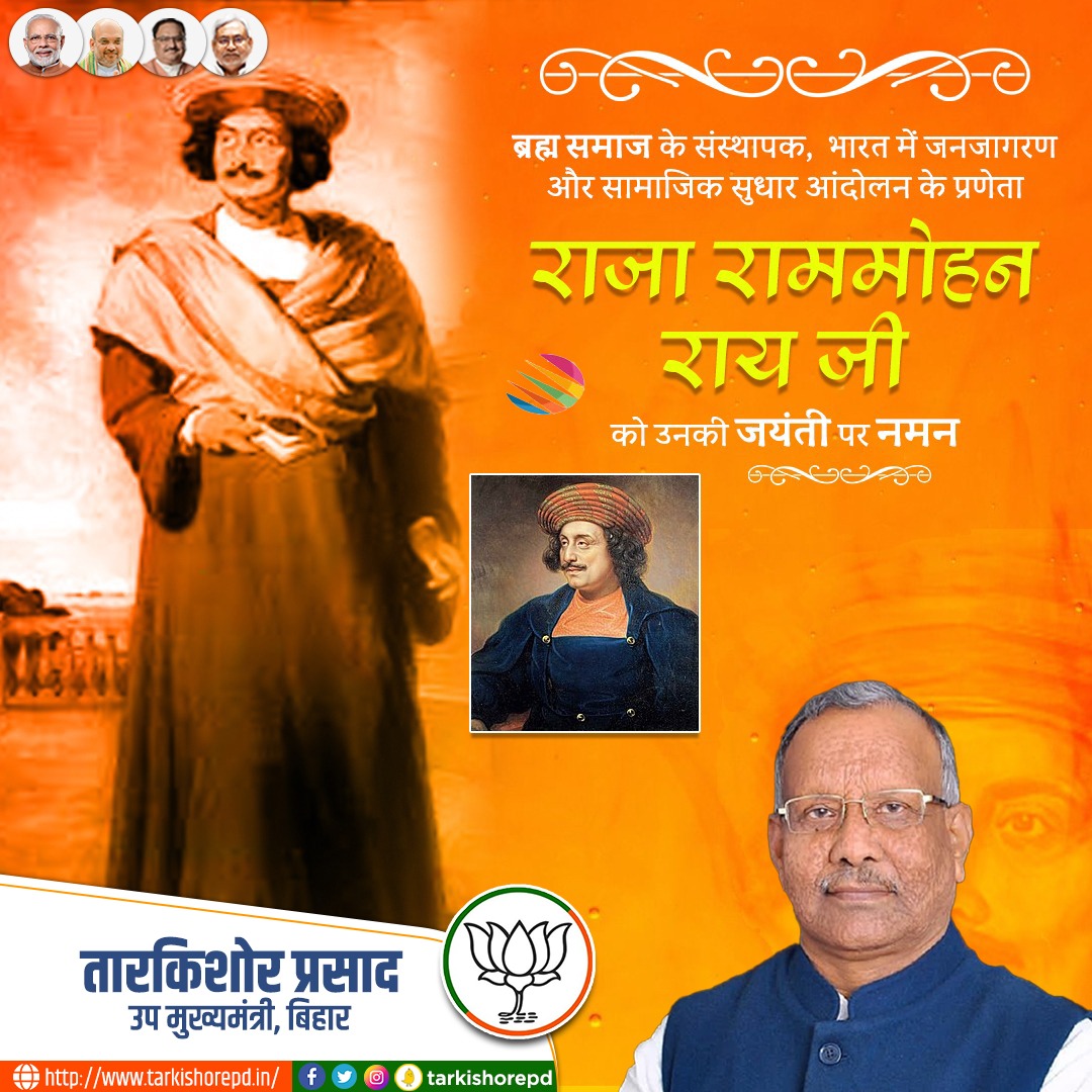 भारतीय पुनर्जागरण के अग्रदूत, ब्रह्म समाज के संस्थापक, भारतीय भाषायी प्रेस के प्रवर्तक, बंगाल में नव-जागरण युग के पितामह व महान समाज सुधारक राजा राममोहन राय जी की जयंती पर विनम्र नमन ।