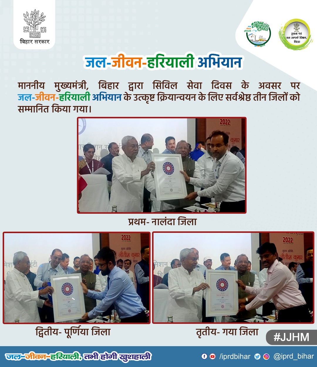 माननीय मुख्यमंत्री, बिहार द्वारा सिविल_सेवा_दिवस के अवसर पर जल-जीवन-हरियाली अभियान के उत्कृष्ट क्रियान्वयन के लिए सर्वश्रेष्ठ तीन जिलों को सम्मानित किया गया। प्रथम- नालंदा, द्वितीय- पूर्णिया एवं तृतीय- गया जिला।
