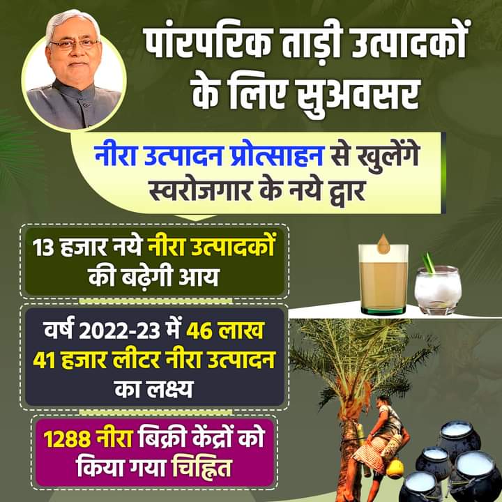 माननीय मुख्यमंत्री श्री नीतीश कुमार जी के कुशल नेतृत्व में पारंपरिक ताड़ी उत्पादकों को बढ़ावा दिया जा रहा है। इसके तहत वर्ष 2022-23 में 40 लाख 41 हजार लीटर नीरा उत्पादन का लक्ष्य रखा गया है। इसके लिए 1288 नीरा बिक्री केंद्रों को चिन्हित किया गया है। https://t.co/ZJBEY425TR